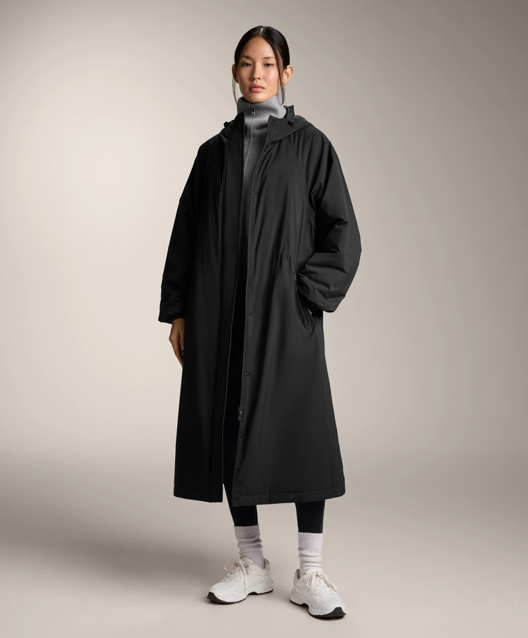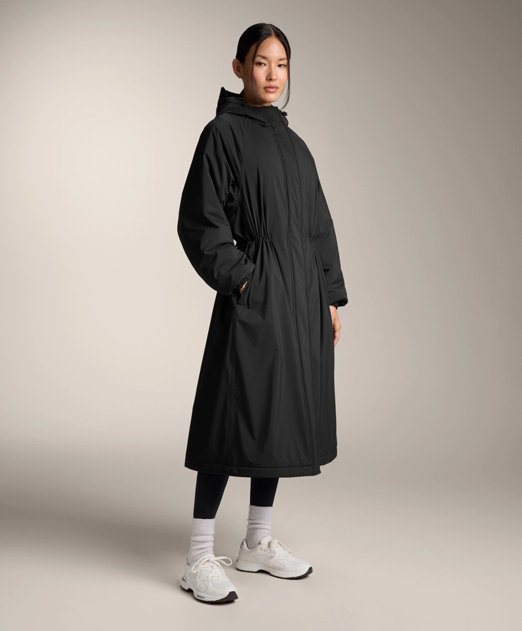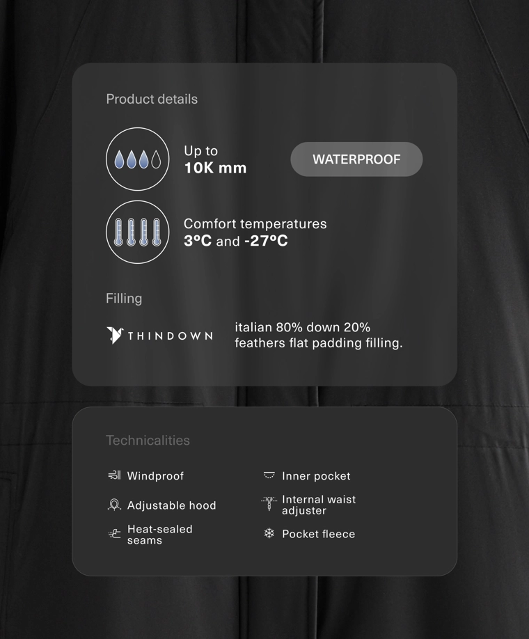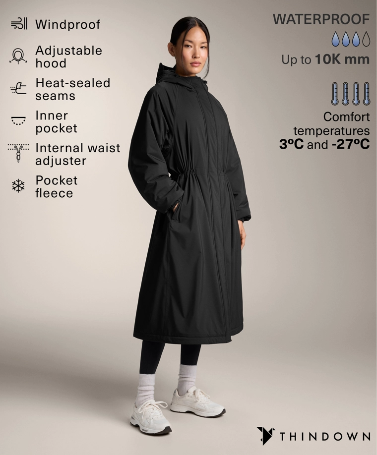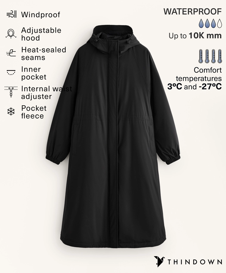 Длинная водонепроницаемая теплая куртка с подкладкой ThindownTM. Подкладка ThindownTM состоит из 80% пуха и 20% пера и покрыта слоем, уменьшающим его объем, — в ней сочетается легкость и высокий теплоизоляционный эффект.Модель застегивается спереди на молнию и кнопки с магнитной застежкой. Пояс-кулиска со шнурком внутри. Высокий воротник и регулируемый капюшон. Боковые и внутренние карманы на подкладке с начесом. Манжеты на отделке рукавов. Ультралегкая, воздухопроницаемая и приятная мягкая ткань. Ветрозащитная ткань с запаянными швами.Ткань выдерживает давление воды ≥10 000 мм. Чтобы повысить степень водонепроницаемости, одежда изготовлена с герметичными застежками-молниями и запаянными швами (по всему изделию или в наиболее важных местах). Изделие защищает от холода при температуре от +3 ºC (низкий уровень активности) до -27 ºC (умеренная активность), что было подтверждено испытаниями в лабораторных условиях с имитацией ветра скоростью 0,4 м/с (одежда на испытуемом: футболка с длинным рукавом и высоким воротником, брюки, нижнее белье, носки, обувь, перчатки и вязаный головной убор.