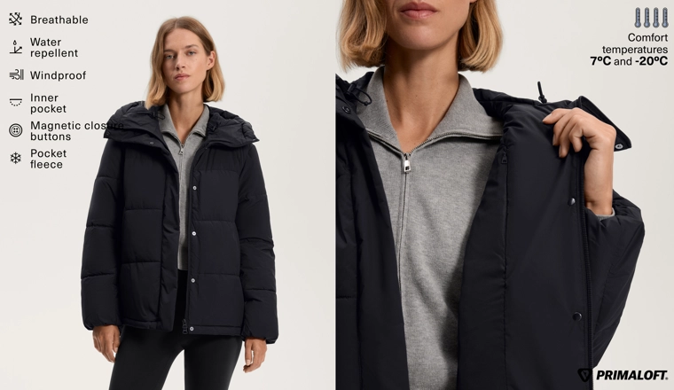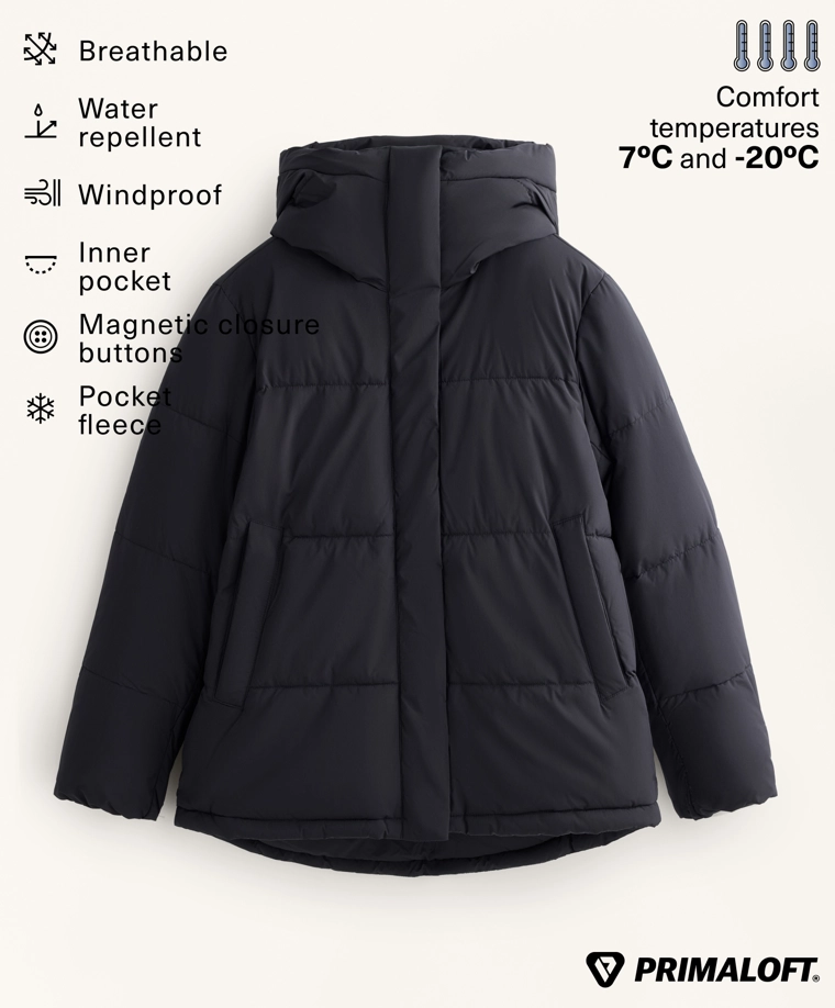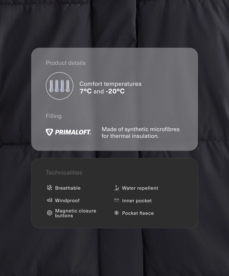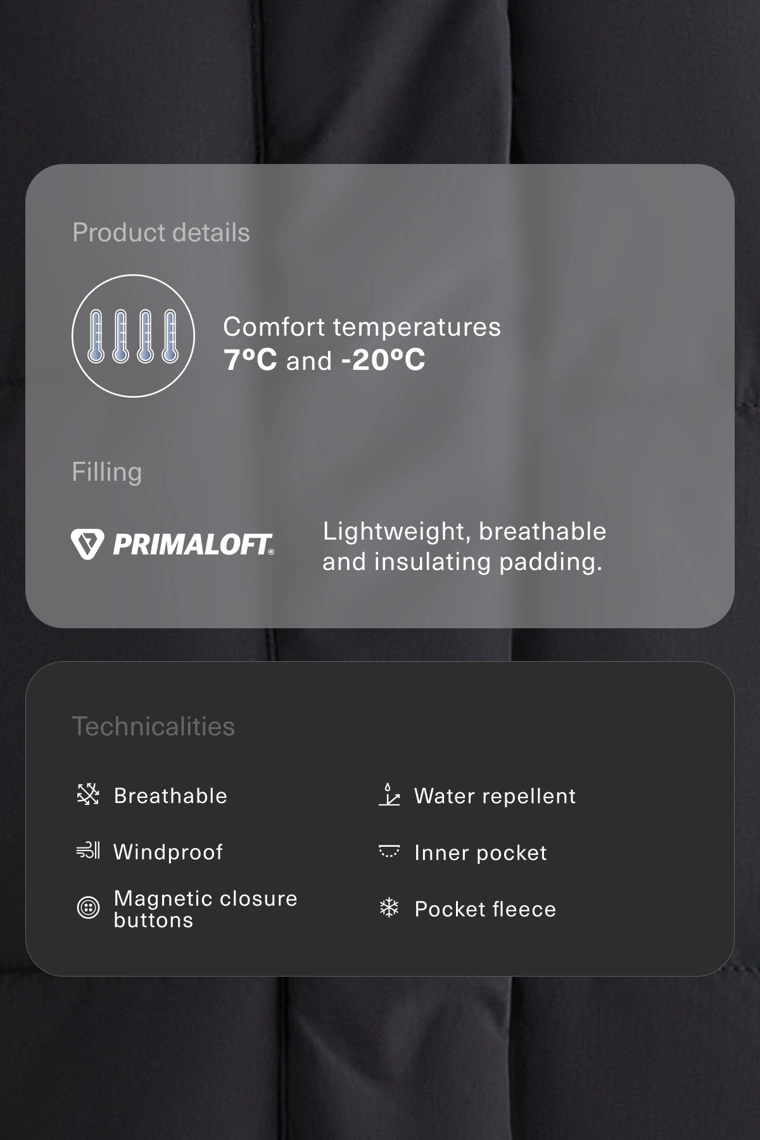 Утепленная куртка из водоотталкивающей ткани с технологией Primaloft®. Регулируемый капюшон, воротник-стойка и застежка на молнию и кнопки с магнитной застежкой спереди. Боковые карманы на подкладке из флиса и внутренний карман. Ветронепроницаемая и дышащая ткань.Технология Primaloft® подразумевает использование синтетических микрофибр, обеспечивающих теплоизоляцию. Даже в намокшем состоянии материал сохраняет теплоизоляционные свойства и легкость, обеспечивая тепло и комфорт.Изделие сертифицировано для защиты от холода при температуре от +7 ºC (низкая активность) до -20 ºC (умеренная активность), что было подтверждено стандартными испытаниями с имитацией ветра скоростью 0,4 м/с, во время которых на испытуемом были надеты футболка с длинными рукавами и высоким воротником, брюки, нижнее белье, носки, обувь, перчатки и вязаная шапка.